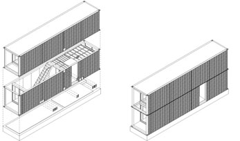 在日本横滨港口的一体式集装箱海滨公寓单体采用了两箱体上下重叠放置的方式进行组合(图 5.7)。入口处设置在底层中部,客厅为两层通高的公共空间,底层布置客厅、入口、卫生间等功能,二层布置卧室功能。箱体与箱体之间通过对位的四个角部螺栓固定,再与基础的混凝土底板连接,形成可以拆卸可再生利用的集装箱建筑。
