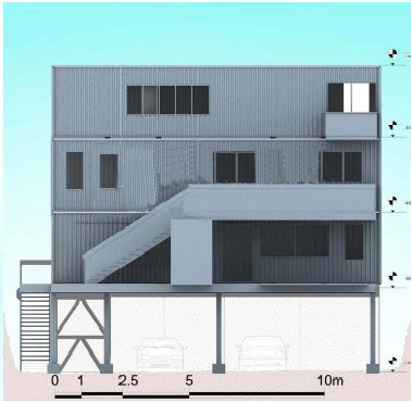 位于新西兰的 Stevens 集装箱住宅,由 ROSS STEVENS 设计并建造。他使用3个40英尺标准钢制集装箱竖向排布来安排空间,同时利用箱体与山体之间的空间来增加其使用空间(图 5.8)。底层为钢结构框架构成的停车库,上部为三层集装箱叠加放置,在临近山体部分设置了直跑楼梯及平台至集装箱二层。整个建筑充分利用了集装箱与山体间的剩余空间,并结合集装箱进行了空间布置。
