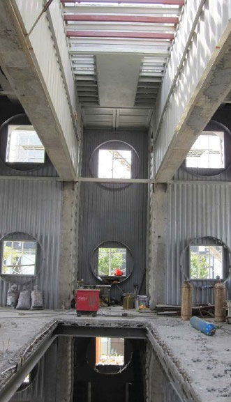 在现场装配建造的过程中,首先装配集装箱门式结构。竖立两侧竖向箱体,再吊装作为大跨结构的顶部箱体,使用竖向箱体上预制的钢牛腿来初步固定住上部横跨的箱体。随后,将顶部箱体与两侧竖向箱体焊接为整体,作为一个完整的集装箱门式结构。同时,相邻两品集装箱门式结构中间预留300毫米的缝隙,当每品集装箱门式结构完成后,便在这300毫米宽度中进行钢筋网的绑扎(图 7.5 中 g 图),然后吊装组装相邻一品集装箱门式结构。当9品集装箱门式结构安装完成后,进行钢筋混凝土墙的浇筑,在这个过程中利用集装箱箱体作为现浇模板。混凝土墙不但可以用于增加集装箱建筑的蓄热能力,同时也增加建筑的结构刚度。