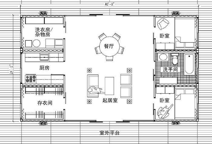 2007年,Logical Homes 推出了他们最具代表性的产品——Aegean。这是一种由两个集装箱、一个大面积的悬臂式屋顶和少量其他构件组成的单层住宅,有两种规格—— Aegean 640 和 Aegean 896,面积分别为59.5m²(640平方英尺)和83.2m²(896平方英尺)。Aegean 640 是 Logical Homes 推出的最小的单位,可作为度假屋使用(图 4-5)。建筑由两个40英尺的集装箱组成,通过打通相邻的侧墙并设置几道内部隔墙,获得了一个具有两倍集装箱开间的融合空间,并在这个空间中划分出了一个起居室、一个卧室以及一个洗手间,大面积出挑的屋顶在建筑正面形成了一个半室外空间(图 4-6)。