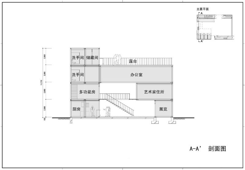 使用这种布局策略进行设计时,应当注意外围箱体与其所围合的中心空间的联系与划分,根据功能与空间的需要决定空间的隔断与联通处理。中心空间与外围空间的联系方式可以有许多种,例如设置门、窗或者半通透的格栅,也可根据需要将整个侧墙的波形钢板移除,让中部空间渗透到“集装箱墙”中去。