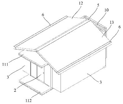 1 箱体;10 箱盖;11 端壁板;111 上端壁板;112 下端壁板;12、13 侧壁板;14 导轨;131 沟槽;2 入户门;3 集成功能空间体;31 j骨轮;4 屋架梁;41 主架梁;42 副架梁;5 屋脊;51 契合部;52 遮盖部;6 导水槽;G 间隙。