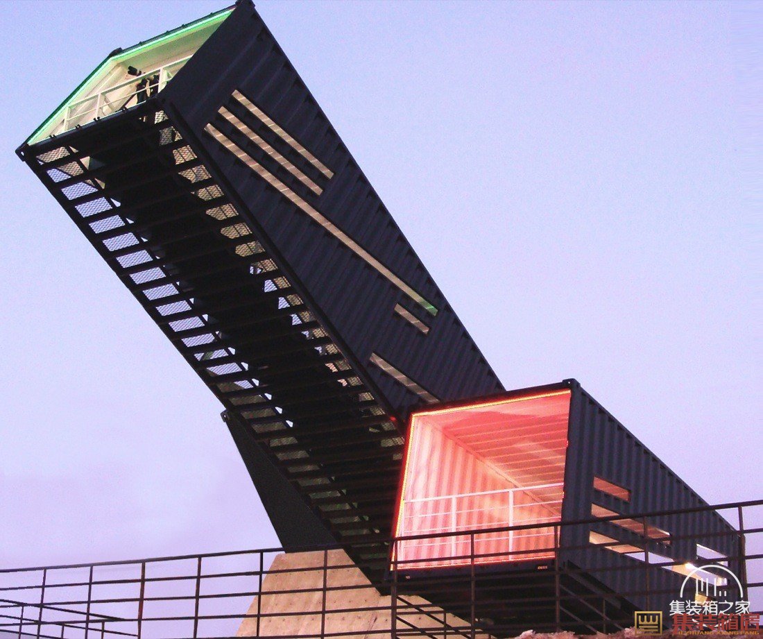 由于建筑基地的水平面太低,无法欣赏美丽的海景,为了克服这种局限性,建筑师就将三个集装箱观景台分别倾斜10度、30度和50度放置。